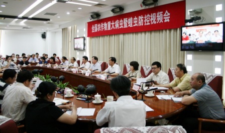會議由農(nóng)業(yè)部總經(jīng)濟師、全國農(nóng)作物重大病蟲暨治蝗指揮部副指揮長陳萌山主持。在31個省、自治區(qū)、直轄市設(shè)立了分會場,各省(區(qū)、市)農(nóng)業(yè)(農(nóng)牧、畜牧)廳(委、局),新疆生產(chǎn)建設(shè)兵團農(nóng)業(yè)局、黑龍江農(nóng)墾總局負責(zé)人,有關(guān)省(區(qū)、市)農(nóng)作物重大病蟲暨蝗災(zāi)防治指揮部成員,重點市、縣蝗蟲防治領(lǐng)導(dǎo)機構(gòu)成員等,共1600余人參加會議。