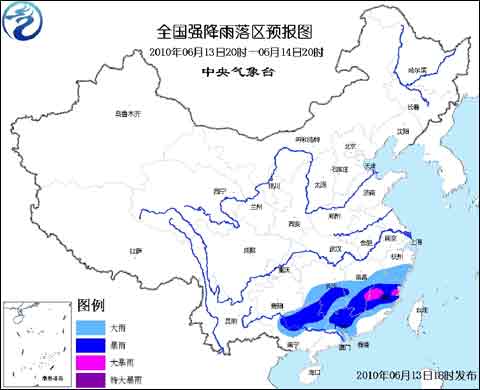 中央氣象臺6月13日18時發(fā)布暴雨藍(lán)色預(yù)警: