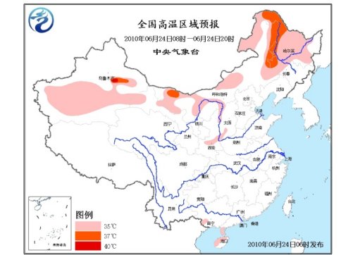 中新網(wǎng)6月24日電 中央氣象臺6月24日06時繼續(xù)發(fā)布高溫藍色預(yù)警:預(yù)計,今天白天,甘肅西部、寧夏北部、內(nèi)蒙古大部、黑龍江大部、吉林西部、山西西南部、陜西關(guān)中地區(qū)、廣東雷州半島、廣西西南部的局部地區(qū)、海南中北部等地有35~37℃的高溫天氣,其中,內(nèi)蒙古西部的局部地區(qū)最高氣溫可達40~41℃。
