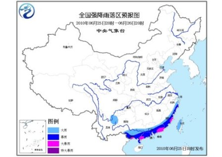 中新網(wǎng)6月25日電 中央氣象臺(tái)今日18時(shí)發(fā)布暴雨藍(lán)色預(yù)警:預(yù)計(jì),6月25日20時(shí)到6月26日20時(shí),浙江東部、福建東部和南部、廣東大部、廣西中南部、臺(tái)灣大部有大雨或暴雨,局地有大暴雨;上述部分地區(qū)并伴有短時(shí)雷雨大風(fēng)等強(qiáng)對(duì)流天氣。另外,云南東北部的局部地區(qū)有大雨。