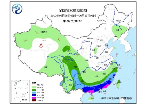 中新網(wǎng)6月26日電 中央氣象臺(tái)26日6時(shí)發(fā)布短期天氣預(yù)報(bào)顯示,未來(lái)三天,青藏高原及其以東大部地區(qū)多降雨天氣,其中,浙江南部、江西南部、福建大部、廣西中南部、廣東大部等地有大雨或暴雨,局地有大暴雨;云南西北部和東部、貴州西部和南部、四川盆地南部、黑龍江東部等地有大雨;上述部分地區(qū)并伴有短時(shí)雷雨大風(fēng)或冰雹等強(qiáng)對(duì)流天氣。
