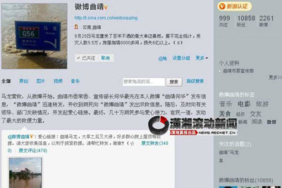 25日晚,云南省曲靖市馬龍縣遭遇特大暴雨,26日中午起,曲靖市委宣傳部部長(zhǎng)何華的個(gè)人微博及宣傳部官方微博——“微博曲靖”開始圖文直播馬龍災(zāi)情與救災(zāi)情況,在馬龍縣城電力、交通、通訊中斷幾成“孤島”的情況下,曲靖官方微博成為網(wǎng)友獲取第一手信息的來(lái)源。