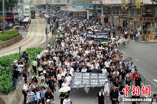 臺灣《中國時報》關注到,首度攜手舉行跨黨派“無聲游行”,約八萬人參加。在哀樂聲中,游行民眾先為死難者默哀三分鐘,隨即從維多利亞公園出發(fā)游行至遮打花園,并綁上黃絲帶對死者悼念,場面相當哀戚。游行途中民眾不呼口號,用沉默展現(xiàn)港人最強烈抗議。