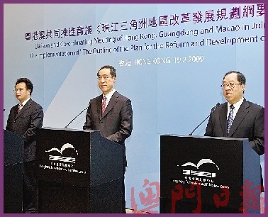 中新網(wǎng)2月20日電 《澳門日報(bào)》今日在頭條刊發(fā)報(bào)道稱,“粵港澳共同推進(jìn)實(shí)施《珠江三角洲地區(qū)改革發(fā)展規(guī)劃綱要》聯(lián)絡(luò)協(xié)調(diào)會議”19日在香港舉行,粵港澳三地就四個(gè)重點(diǎn)工作達(dá)成共識。