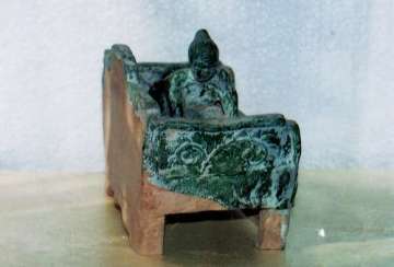 1、床:該床尺寸:長20.5cm,高:14cm,寬:12cm。從造型看漢代床的特征極為明顯。該床由三部分組成:床板,邊框,支架。該床為厚板與邊框護(hù)板相連。床面上刻有幾何形方格紋,又稱錢眼紋,泉源紋,即,古銅錢中心方孔紋飾。寓意睡臥錢眼,后輩有錢。床上邊框?yàn)樽蟆⒑、右三面高護(hù)板組成。后護(hù)板中高、兩低。每塊護(hù)板上模印草花。寓意草繁茂盛。床板與邊框護(hù)板相連放在四腿支架上。四腿支架前后又有護(hù)板。前護(hù)板上三個(gè)方格內(nèi)有卷草模印圖案,后護(hù)板無釉無紋為黃泥土胎。