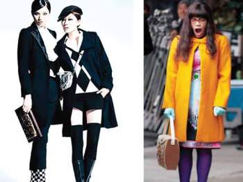 右:H形雙排扣大衣搭配白襯衣以及黑白菱形格毛衣,充滿學(xué)院派風(fēng)格,皮質(zhì)鴨舌帽和斜挎的小背包增加一絲俏皮感。下半身搭配迷你短褲和長及大腿的黑色筒襪,長襪和短褲之間露出大腿,充滿率真的性感味道!