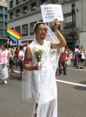 很多亞裔同志勇敢展示自己,其中不乏華裔身影。一位身穿結(jié)婚禮服的亞裔男同志,手舉“要求紐約承認同性婚姻”的牌子,表達了同志們的呼聲。也有不少同志的支持者參加游行,梁淑儀支持身為女同志的姐姐梁淑安一起來游行,當(dāng)義工的劉健行和劉素夫婦表示有很多同志朋友,大家都是一樣的人,沒有什么不同。(劉爽)