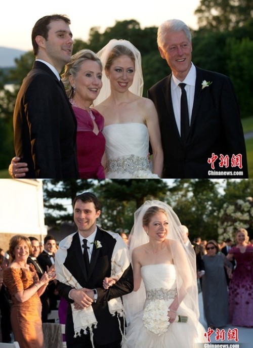 新郎麥文斯基與前總統(tǒng)克林頓則穿上英國品牌BURBERRY,希拉里選穿美國設(shè)計(jì)師品牌奧斯卡德拉倫塔量身打造的莓紅色禮服。