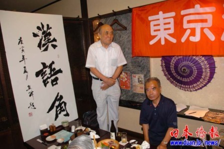 交流會(huì)上展示了旅日華人書法家熊峰和日本書法家冢越誠分別題寫的“漢語角”,受到大家的好評。