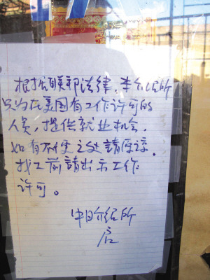 報(bào)道指出,在7日?qǐng)?zhí)法行動(dòng)中有一名石姓女子被捕的中日職業(yè)介紹所仍繼續(xù)關(guān)門(mén),8日一早門(mén)上就張貼出中英文告示,明確告訴找工者必須有工作許可證。