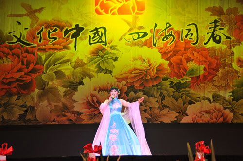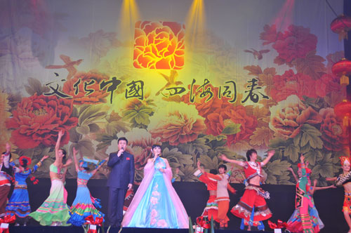 演出前,藝術(shù)團(tuán)團(tuán)長(zhǎng)、國(guó)務(wù)院僑辦副主任趙陽(yáng)發(fā)表了熱情洋溢的講話。他代表國(guó)務(wù)院僑辦和李海峰主任向旅居澳大利亞的廣大僑胞和現(xiàn)場(chǎng)觀眾致以新春的祝福。趙陽(yáng)指出,剛剛過(guò)去的2009年,是新中國(guó)成立60周年,60年來(lái)中國(guó)所取得的巨大成就離不開(kāi)海外僑胞的關(guān)心和支持!拔幕袊(guó) 四海同春”藝術(shù)團(tuán)為大家?guī)?lái)了祖國(guó)親人的親切問(wèn)候和美好祝愿。