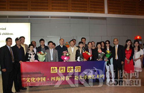 中新網(wǎng)2月20日電 據(jù)澳洲《新快報》報道,《文化中國•四海同春》藝術(shù)團成功在墨爾本舉行首演后19日上午抵達悉尼。中國駐悉尼總領(lǐng)館總領(lǐng)事胡山、僑務(wù)領(lǐng)事張龍忠、秦向東、朱昊、澳大利亞華人團體協(xié)會主席吳昌茂、著名僑領(lǐng)周光明、澳大利亞澳華文聯(lián)主席余俊武、澳洲孔子研究會主席錢啟國以及悉尼藝術(shù)界、僑界代表等到機場歡迎藝術(shù)團團長、國務(wù)院僑辦副主任趙陽一行。