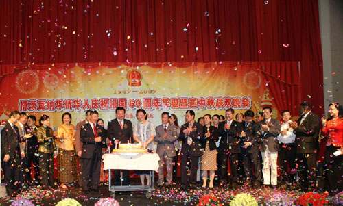 中新網9月20日電 據非洲《華僑周報》報道,16日,中國駐博茨瓦納大使館與旅博僑團在首都哈博羅內聯合舉行慶祝中國成立60周年暨迎中秋晚會。駐博大使劉煥興、經商參贊宮和平、博茨瓦納中國和平統一促進會會長喬良、博茨瓦納華商總會會長劉冰、博茨瓦納-中國友好協會執(zhí)行主席南庚戌以及福建同鄉(xiāng)會、江西同鄉(xiāng)會、馬翁僑社、中資企業(yè)協會等組織及僑胞代表共300余人歡聚一堂,共慶偉大祖國60周年華誕,共迎中秋傳統佳節(jié)。