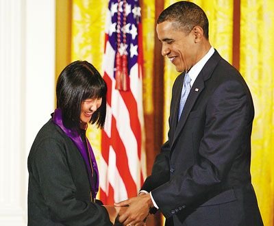 中新網(wǎng)2月27日電 據(jù)美國《世界日報》報道,20歲那年設(shè)計華盛頓越戰(zhàn)紀(jì)念碑而一夜成名的華裔建筑師林瓔(Maya Lin),當(dāng)?shù)貢r間25日晚在白宮獲奧巴馬總統(tǒng)頒發(fā)2009年國家藝術(shù)獎?wù)。林瓔這項成功的設(shè)計已和美國歷史融為一體。