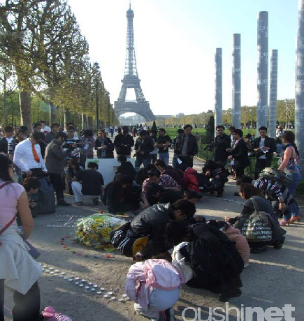數(shù)百名在法留學生和華人于18日在巴黎艾爾菲鐵塔前的和平墻點起蠟燭,為青海玉樹地震的遇難者祈福。他們將數(shù)百支蠟燭擺成巨大的心形和“玉樹”字樣,然后逐一將蠟燭點燃,與此同時,祈福板上也留下他們各式的祝福語,表達自己對災(zāi)區(qū)同胞們血脈相連的感情。望著燃燒的蠟燭,留學生和華人高呼“玉樹加油”,衷心的祈求青海玉樹地震中的生者平安,死者安息;顒游簧俾愤^的法國人和游人也停下腳步,為玉樹地震的死難者哀悼。