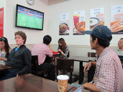 不少球迷早已準(zhǔn)備好享受這場足球盛宴,據(jù)美國《星島日報(bào)》報(bào)道,紐約下東城不少酒吧、餐廳甚至小區(qū)團(tuán)體早已準(zhǔn)備了看球場地,以吸引顧客。華埠地威臣街“香港站”快餐店門外的大餐牌早早的就換成世界杯賽事的中英文海報(bào)和賽程細(xì)表,店內(nèi)兩部寬屏的液晶電視,輪流播著不同體育節(jié)目。