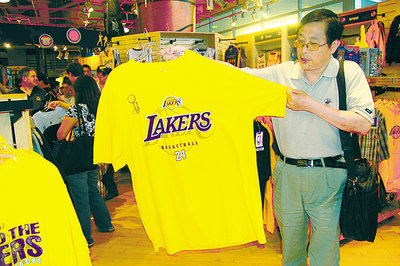 自夏威夷前往洛杉磯看望兒子的華先生和太太正在挑選湖人隊(duì)胸章,華先生表示,胸章較便宜,容易攜帶,盡量多買(mǎi)些送給夏威夷的鄰居朋友。而華太太則為兒子、孫女挑選湖人隊(duì)T恤衫、帽子。華先生說(shuō),估計(jì)花費(fèi)近200元購(gòu)買(mǎi)各種湖人紀(jì)念品。