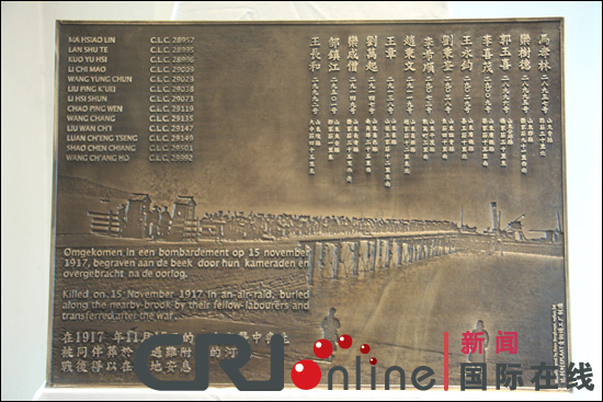 90多年前,13名華工迫于生計(jì),告別家鄉(xiāng),長(zhǎng)途跋涉,踏上了處在硝煙彌漫中的歐洲大陸。在比利時(shí)的坡泊林,他們參與了協(xié)約國的戰(zhàn)地后勤工作,并與當(dāng)?shù)厝罕娊Y(jié)下了深厚的友誼。13名華工全部來自中國山東省。1917年11月15日,他們?cè)诘萝娍找u中喪生。遇難后,他們被同伴葬于坡泊林的一條小河邊。