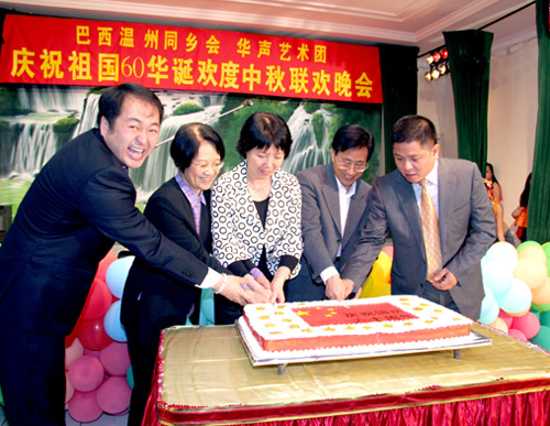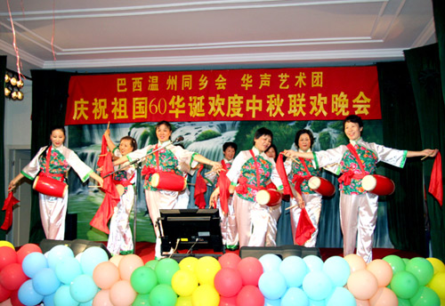 中新網(wǎng)9月21日電 據(jù)巴西南美僑報(bào)/巴西僑網(wǎng)報(bào)道,巴西溫州同鄉(xiāng)會(huì)與華聲藝術(shù)團(tuán)慶祝祖國(guó)60華誕歡度中秋節(jié)聯(lián)歡晚會(huì)19日晚在溫州同鄉(xiāng)會(huì)會(huì)館舉行,中國(guó)駐圣保羅總領(lǐng)事孫榮茂夫婦以與數(shù)百僑胞歡聚一堂,度過(guò)一個(gè)熱烈歡欣的夜晚。