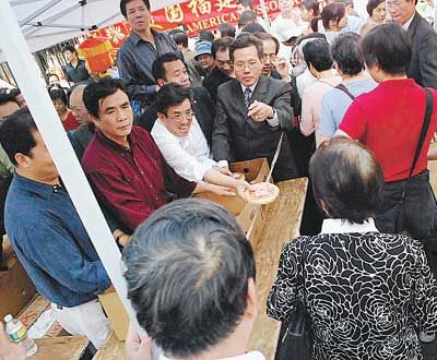 中新網(wǎng)9月23日電 據(jù)美國(guó)《世界日?qǐng)?bào)》報(bào)道,今年的農(nóng)歷中秋佳節(jié)落在10月3日,美國(guó)福建同鄉(xiāng)會(huì)21日與20多個(gè)社團(tuán)和政府部門在紐約曼哈頓華埠舉行盛大的“中秋福建街坊節(jié)”,吸引超過(guò)5000民眾參加,其中大部分為閩籍鄉(xiāng)親,也有不少非華裔民眾湊熱鬧。福建同鄉(xiāng)會(huì)并在下午為鄉(xiāng)親派發(fā)福建的傳統(tǒng)月餅,共派出1500多份,眾多鄉(xiāng)親開(kāi)心排隊(duì)領(lǐng)取。