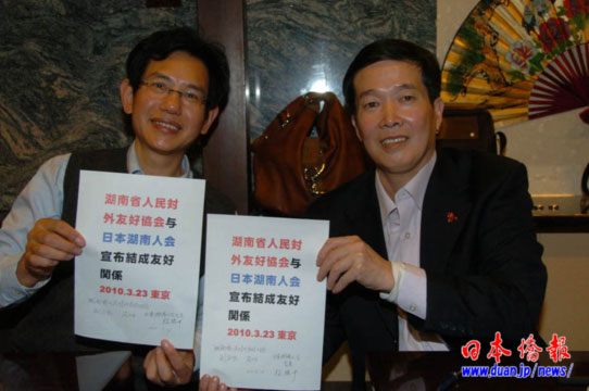 中新網(wǎng)3月24日電 據(jù)《日本僑報》報道,3月23日下午,正在日本訪問的湖南省人民對外友好協(xié)會專職副會長龐力平一行5人,來到位于東京池袋的湖南會館,和日本湖南人會會長副會長秘書長及部分理事等進行了座談,雙方就推進日本與湖南的交流等達成多項共識,并宣布湖南省人民對外友好協(xié)會與日本湖南人會結為友好關系。