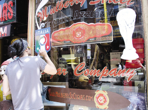 逛小意區(qū)時,看見一個禮品店小伙子在門外圖畫意大利隊隊徽和大力神杯。一名賣球衣的華人表示,雖然現在小意區(qū)還不太“熱”,但到意大利隊出場那天,整個小意區(qū)都會瘋起來,那時球衣就好賣了。