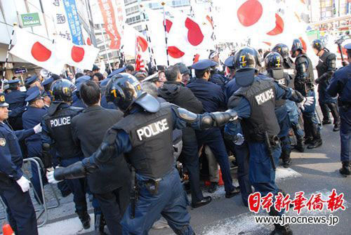 面對(duì)右翼分子的叫囂,“陽(yáng)光城”的華人員工顯得非常沉著冷靜,依然熱情接待來(lái)到這里的每一位客人。在現(xiàn)場(chǎng),日本警方也積極維護(hù)華人不受傷害。右翼分子在講演中攻擊中國(guó)留學(xué)生,一位中國(guó)女留學(xué)生勇敢地站出來(lái),大聲說(shuō):“我是中國(guó)人,是中國(guó)留學(xué)生,你們都是‘右翼垃圾’!”當(dāng)右翼分子要對(duì)這名女學(xué)生動(dòng)手時(shí),警員立即沖過(guò)來(lái)加以保護(hù)。
