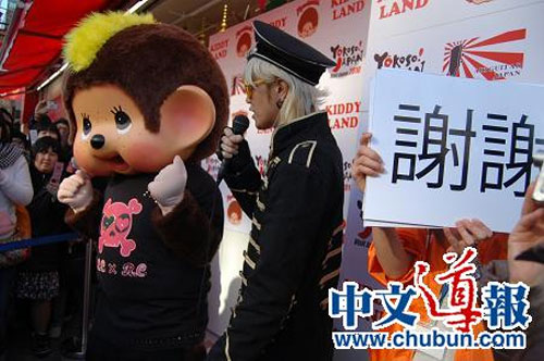 1月30日下午2時(shí),身穿旗袍的主持人小田小姐宣布“Yokoso! Japan year2001年冬季宣傳活動(dòng)”開(kāi)始,接著由MAY等“空氣吉他日本”的成員做精彩表演,最后蒙奇奇出場(chǎng),蒙奇奇的后面有人舉著用中文寫成的展示它的身體語(yǔ)言所表現(xiàn)的意思的牌子,場(chǎng)上氣氛十分熱烈。(張石)