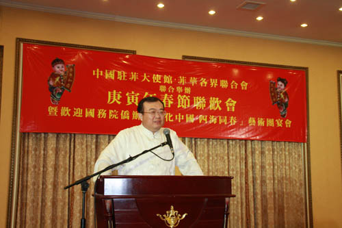 當(dāng)天晚上,中國(guó)駐菲律賓大使館和菲華各界聯(lián)合會(huì)舉辦盛大的聯(lián)歡晚宴,歡迎藝術(shù)團(tuán)的到來(lái)。菲華各界聯(lián)合會(huì)主席戴宏達(dá)、中國(guó)駐菲律賓大使劉建超、藝術(shù)團(tuán)團(tuán)長(zhǎng)熊昌良分別發(fā)表熱情洋溢的致辭。在致辭中,戴宏達(dá)主席和劉建超大使對(duì)國(guó)務(wù)院僑辦組派如此高水準(zhǔn)的藝術(shù)團(tuán)來(lái)菲演出表示感謝,各位藝術(shù)家放棄在春節(jié)與家人團(tuán)聚的機(jī)會(huì),千里迢迢赴海外慰問僑胞,用歡快的歌聲和舞蹈為海外僑社增添了喜慶的春節(jié)氣氛。全體旅菲僑胞將翹首期盼藝術(shù)團(tuán)的演出取得圓滿成功。