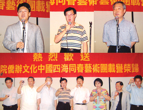 中國駐菲大使館白天代辦,王軍領事等使館領導,藝術團團長熊昌良,藝術團全體演員和菲華各界聯(lián)合會名譽主席,常務委員、委員等出席了歡送宴會。中國駐菲大使館白天政務參贊、藝術團團長熊昌良,菲華各界聯(lián)合會主席戴宏達先后致詞。該會委員們與藝術家們歡聚一堂,大家觸光交錯,氣氛熱烈。