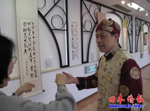 這位濃眉大眼的大漢,是湖南岳陽(yáng)人,眉宇間有一股坦蕩之氣逼人?傋尮P者懷疑是武林中人。就是這位,自2001年來(lái)日本傳播指書文化,短短10年間,已是列島上下,上至國(guó)家政要,下至普通市民,爭(zhēng)相結(jié)交的人氣者。