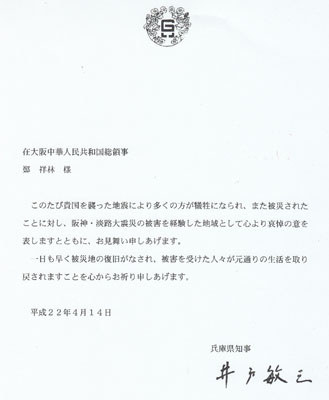 兵庫縣知事井戶敏三在慰問電中說:“獲悉貴國發(fā)生了不幸的地震導致很多人民犧牲,作為有經歷過阪神淡路大震災的地區(qū)兵庫縣,我們對受災者表示由衷的哀悼和深刻的慰問。我們祈禱災區(qū)早日恢復正常,從心里祝愿地震受害者早日康復!