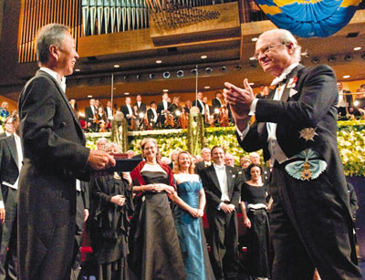 中新網(wǎng)12月11日電 2009年諾貝爾獎(jiǎng)?lì)C獎(jiǎng)禮昨在瑞典斯德哥爾摩演奏廳舉行,一生獲獎(jiǎng)無(wú)數(shù)的光纖之父、前香港中文大學(xué)校長(zhǎng)高錕,正式從瑞典國(guó)王古斯塔夫.卡爾16世(Carl XVI Gustaf)手中接過(guò)諾貝爾物理學(xué)獎(jiǎng)。期間大會(huì)更為他作出特別安排,由國(guó)王走到其座位旁邊頒獎(jiǎng),盛裝出席的他,以燦爛的笑容迎接氣氛莊嚴(yán)但歡樂(lè)的歷史性一刻。
