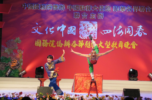 這是國務(wù)院僑辦和中國海外交流協(xié)會“文化中國·四海同春”2010年春節(jié)赴菲律賓藝術(shù)小組在演出,只見臺下掌聲不斷,臺上精彩紛呈:《滾燈》語言詼諧,情節(jié)幽默,將川北燈戲的民間生活情趣描繪得淋漓盡致!蹲兡槨肥谴▌≈猩衿婷利惖慕^技,大木偶變臉更是精彩絕倫,令人嘆為觀止。