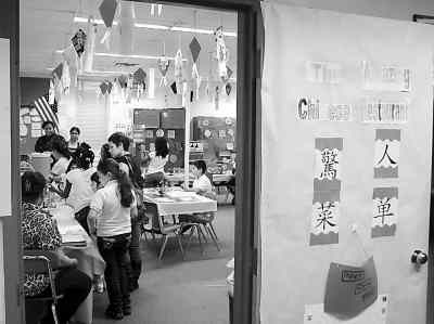 在社區(qū)活動日當(dāng)天,很多家長放下手頭工作,早早趕到學(xué)校,要親身體驗一下孩子們在學(xué)校的學(xué)習(xí)生活。剛步入學(xué)校,他們就感受到濃濃的中國氣息。整個學(xué)校的走廊上貼滿了諸如中國國旗、長城、中國龍、熊貓、扇子、風(fēng)箏、臉譜等由學(xué)生制作的手工和藝術(shù)作品,還有很多寫了漢字或用英文介紹中國項目學(xué)習(xí)成果的海報。學(xué)校的圖書室更是成為了中國博物館,里面充滿了體現(xiàn)中國文化元素的實物和學(xué)生作品,還有六年級學(xué)生于春假期間赴中國訪問姊妹學(xué)!旖蚰祥_大學(xué)附屬小學(xué)的照片展。五年級教室則變成了一個中國飯館,把一塊錢交給學(xué)生扮演的服務(wù)生,你就可以品嘗中國飯了。除此之外,作為“中國日”的演出節(jié)目,很多班級表演了中國歌舞,六年級的學(xué)生還表演了太極拳和講述中國故事的舞臺短劇。