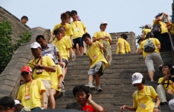 中新網(wǎng)7月28日電 據(jù)廣東僑網(wǎng)消息,在人民大會堂參加完隆重的開營儀式后,廣東省僑辦組織的550多名華裔青少年乘坐12部大巴,于7月25日下午浩浩蕩蕩的前往京城之旅的第一站——京北長城沿線最著名的古關(guān)城居庸關(guān),勇于攀登的廣東團(tuán)營員成為“中國尋根之旅”團(tuán)隊(duì)中的首批“好漢”,很多第一次到中國的華裔青少年實(shí)現(xiàn)了成為“長城好漢”的夢想。