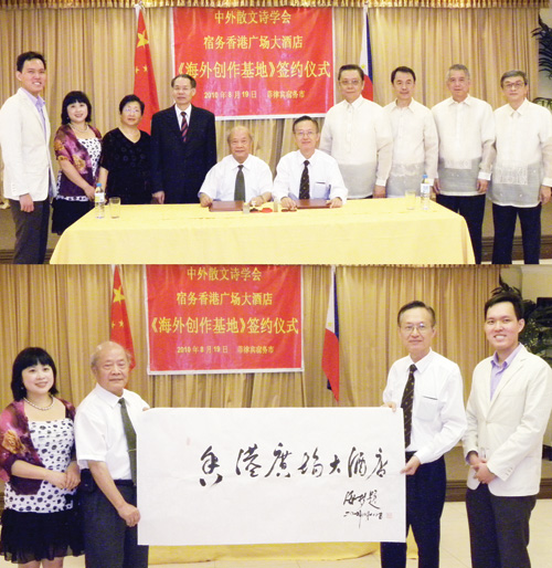 在何時敬和宿霧華社人士的共同見證下,中外散文詩學會與菲律賓宿霧香港廣場大酒店于19日晚,簽署了創(chuàng)設“中外散文詩學會海外創(chuàng)作基地”的協(xié)議。