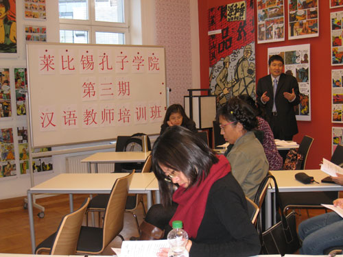 本期培訓(xùn)班的主講是萊比錫孔子學(xué)院對(duì)外漢語(yǔ)教師高永安。他結(jié)合德語(yǔ)、漢語(yǔ)的語(yǔ)音比較,講述了對(duì)德漢語(yǔ)教學(xué)中的語(yǔ)音教學(xué)技巧;結(jié)合漢語(yǔ)的詞匯特點(diǎn),講述了詞匯教學(xué)的主要方法,并重點(diǎn)介紹了語(yǔ)素教學(xué)法。參加培訓(xùn)的教師們對(duì)課堂內(nèi)容很感興趣,他們一邊聽(tīng)講,一邊提問(wèn)題,課堂氣氛十分活躍。學(xué)員們還分享了各自在教學(xué)實(shí)踐中的經(jīng)驗(yàn),探討了教學(xué)中出現(xiàn)的問(wèn)題,并共同尋求解決的辦法。