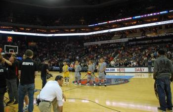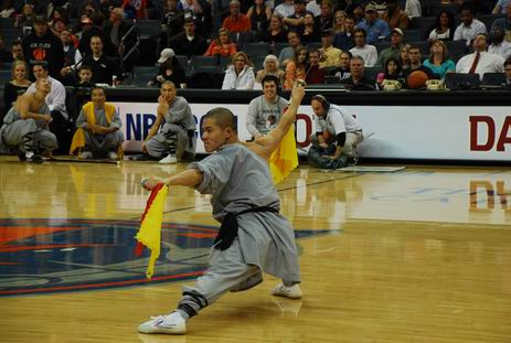 中場休息期間在全場觀眾經(jīng)久不息地助威聲下,費佛爾大學(xué)孔子學(xué)院邀請的4位功夫大師由愛美麗·羅德女士率領(lǐng)步入球場中央,功夫大師們恭謹?shù)叵蛉珗鲇^眾行佛禮。這時賽場主持人以NBA式的渾厚嗓音向現(xiàn)場觀眾發(fā)布: “讓我們熱烈歡迎今晚的特別嘉賓,費佛爾大學(xué)孔子學(xué)院少林功夫大師,他們給我們帶來了擁有1700年歷史的中國地道的少林功夫!