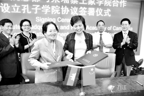 經(jīng)過近兩年的精心籌備,設立王家學院孔子學院的條件已經(jīng)成熟,中柬合作雙方加緊履行申辦孔子學院的相關手續(xù)。8月12日,應九江學院的邀請并受宋安副總理的委托,柬埔寨王家學院院長克洛堤達博士率王家學院代表團抵達北京,訪問國家漢辦暨孔子學院總部?鬃訉W院總部總干事許琳女士會見了克洛堤達博士,雙方分別代表孔子學院總部和柬埔寨王家學院,簽署了《中國孔子學院總部與柬埔寨王家學院關于合作設立王家學院孔子學院的協(xié)議》。至此,柬埔寨第一家孔子學院正式宣告誕生。