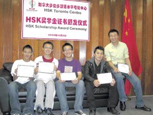 郭凌清、李賦涵、張庭、黃帝鈞、張龍江五位同學(xué),都在去年參加由加拿大多倫多漢語水平考試中心主辦的中國國家漢語水平考試,并取得優(yōu)異成績。4日他們在親友和家長的陪同下,領(lǐng)取國家漢辦孔子學(xué)院獎學(xué)金證書,并暢談暑期前往中國學(xué)習(xí)漢語的美妙經(jīng)歷。