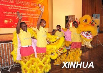 10月12日,在肯尼亞首都內(nèi)羅畢,4名內(nèi)羅畢大學(xué)孔子學(xué)院的學(xué)生在聯(lián)歡會(huì)上表演中國(guó)舞獅。當(dāng)天,200多名來(lái)自北京理工大學(xué)、內(nèi)羅畢大學(xué)孔子學(xué)院和津巴布韋大學(xué)孔子學(xué)院的大學(xué)生們?cè)趦?nèi)羅畢大學(xué)舉行聯(lián)歡會(huì),同學(xué)們以合唱、舞蹈等精彩的節(jié)目交流情感傳遞友誼。(新華社/徐速繪 攝)