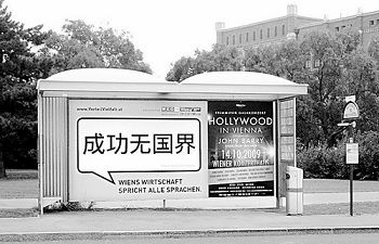 近日,奧地利維也納街頭出現(xiàn)了一些漢字廣告。隨著中國(guó)國(guó)際影響的增加,奧地利人對(duì)中國(guó)的關(guān)注度和對(duì)中國(guó)文化的興趣也在不斷上升。維也納大學(xué)漢學(xué)系的學(xué)生從中國(guó)改革開(kāi)放前的約50人激增到現(xiàn)在的約700人;奧地利的漢語(yǔ)教學(xué)機(jī)構(gòu)從維也納大學(xué)漢學(xué)系1家增加到現(xiàn)在的約70家;通過(guò)各種方式學(xué)習(xí)漢語(yǔ)的有數(shù)千人。當(dāng)?shù)亟逃块T已在考慮將漢語(yǔ)列入中學(xué)的教學(xué)大綱。正是在這一背景下,漢字廣告牌出現(xiàn)在維也納街頭。圖為10月8日維也納南火車站旁一個(gè)公共車站的廣告牌,上面張貼著維也納商會(huì)的廣告“成功無(wú)國(guó)界”。(方祥生 攝)