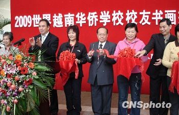 11月17日,2009世界越南僑校校友書畫攝影藝術(shù)展在廣西南寧開展。參展的近50幅作品由來自世界各地的越南僑校校友畫家、書法家創(chuàng)作,包括加拿大溫哥華藝術(shù)家韋長華、加拿大著名攝影家焦根基等。藝術(shù)展分為油畫、水墨、水彩、書法等種類,內(nèi)容涉及山水花鳥、人物、歷史、古詩詞等。圖為廣西壯族自治區(qū)僑聯(lián)副主席劉漢祥、加拿大越北華人聯(lián)合總會主席謝卓裕等嘉賓為藝術(shù)展剪彩。 中新社發(fā) 黃艷梅 攝