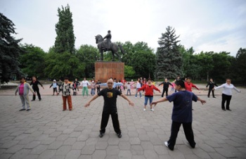 每周二與周五早上八點,武術班都要在比什凱克市內街心公園練習一小時,此舉吸引了不少過路人的觀看和參與,成為了一道別具特色的風景線,很受當?shù)孛癖姎g迎。