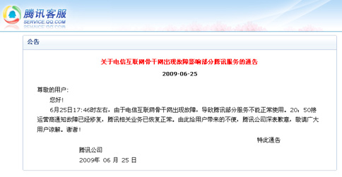 昨晚20時20分許,記者在騰訊官方網上看到一則《關于運營商設備故障影響部分騰訊服務的通告》已經發(fā)布,回應稱:6月25日17時46分左右,由于電信運營商出現(xiàn)設備故障,導致騰訊部分服務不能正常使用。騰訊正在積極配合運營商進行故障排除。
