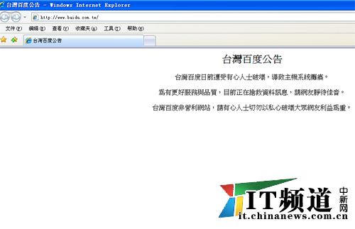 臺(tái)灣百度發(fā)布的公告稱:“臺(tái)灣百度日前遭受有心人士破壞,導(dǎo)致主機(jī)系統(tǒng)癱瘓。為有更好服務(wù)與質(zhì)量,目前正在搶救數(shù)據(jù)訊息,請(qǐng)網(wǎng)友靜待佳音。臺(tái)灣百度非營利網(wǎng)站,請(qǐng)有心人士切勿以私心破壞大眾網(wǎng)友利益為重!