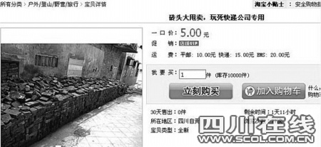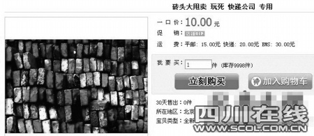 近日,店主“千尋kission”在淘寶網(wǎng)上發(fā)布了“磚頭大甩賣,玩死快遞公司專用”的銷售標(biāo)題,表示將以5元一斤的價(jià)格販賣磚頭。其中的產(chǎn)品說明還頗有幾分《武林外傳》中呂秀才的風(fēng)采:“泄憤也可用磚頭,本磚頭專為對(duì)付那些服務(wù)態(tài)度不好的快遞送貨員設(shè)計(jì),如果你們對(duì)那些惹您生氣的快遞員投訴無(wú)門,無(wú)處泄憤請(qǐng)拍下此產(chǎn)品!