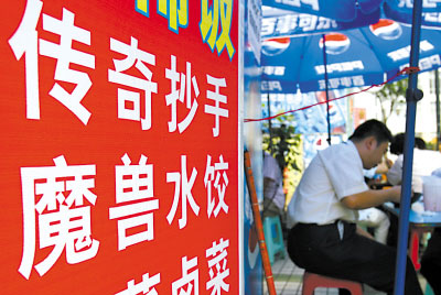 “來二兩魔獸餃子,再來一份屠龍刀!”凌晨1點(diǎn),在網(wǎng)吧拼殺5個(gè)小時(shí)后吃碗餃子,已經(jīng)成了網(wǎng)友“丁丁貓”的習(xí)慣。近日,在解放碑附近,一家以網(wǎng)絡(luò)游戲以及道具名稱命名的面食店,逐漸走紅于街坊和網(wǎng)絡(luò)間。