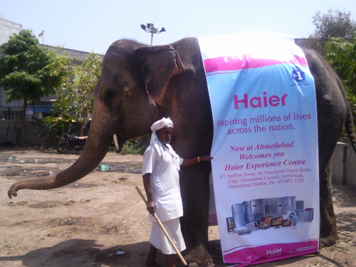 中新網(wǎng)4月8日電 在印度,大象是吉祥之物。日前,在印度著名的旅游城市艾哈邁達巴德的街頭,一頭背上馱著海爾宣傳畫的大象,氣宇軒昂地穿梭在繁華的街市,為新開業(yè)的海爾體驗店助威宣傳。這種宣傳方式別出心裁,吸引了很多印度消費者來到海爾體驗店體驗海爾全系列高端差異化產品。